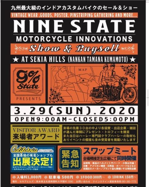 NINE STATE セキアヒルズ Posted on 2020年3月13日2020年3月13日 by bikeron 3月29日はNINE STATE セキアヒルズツーリング! 3月29日 九州、熊本南関町、セキアヒルズにて ビンテージモーターサイクルショーが開催されます。バイクロンもツーリングに合わせて参加します!皆も行きましょう! ツーリング日時:3月29日 集合場所 小倉東IC-8:00 古賀SA下り-8:40 広川SA下り-10:00です!ぜひ参加お願いします。